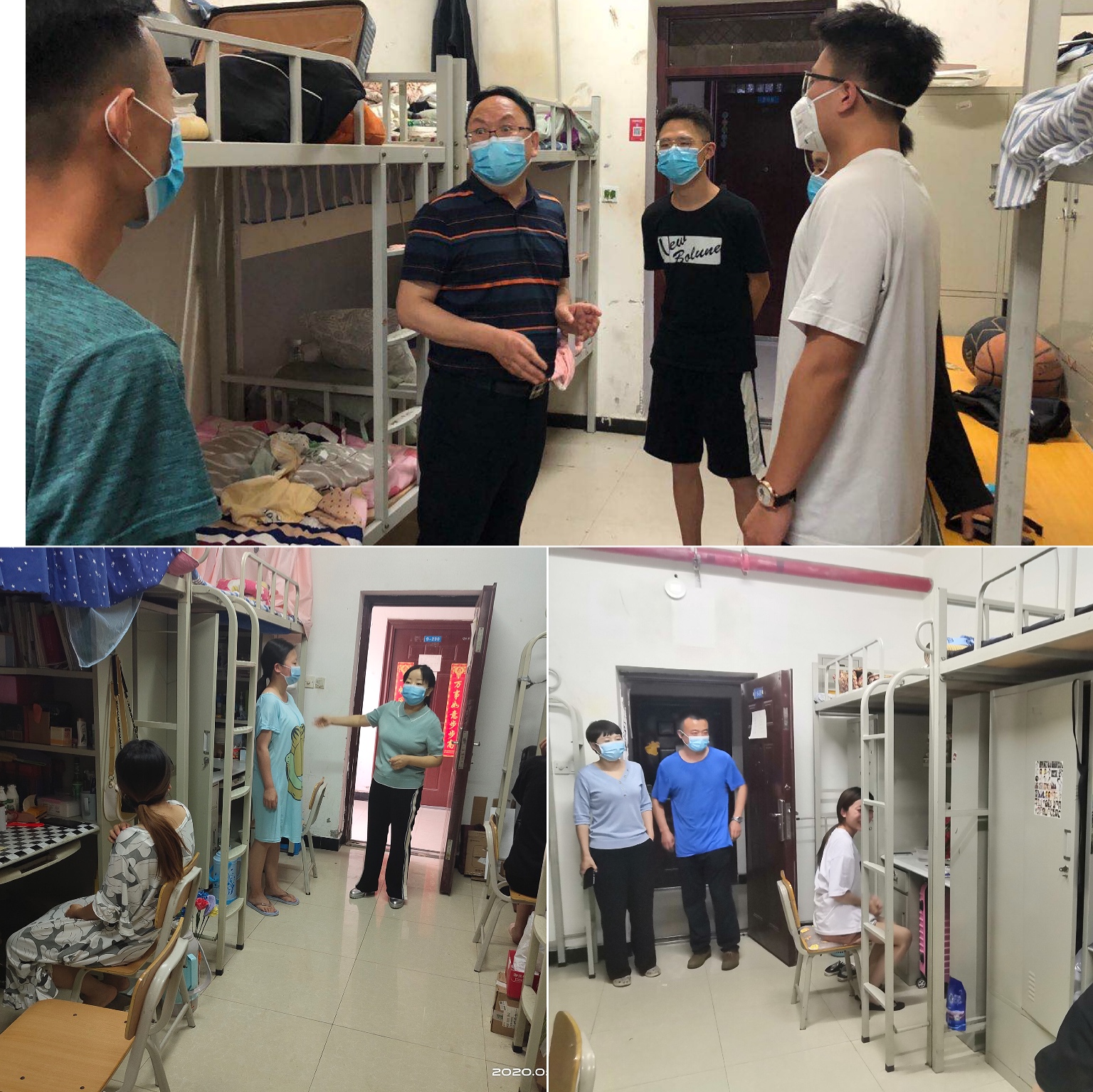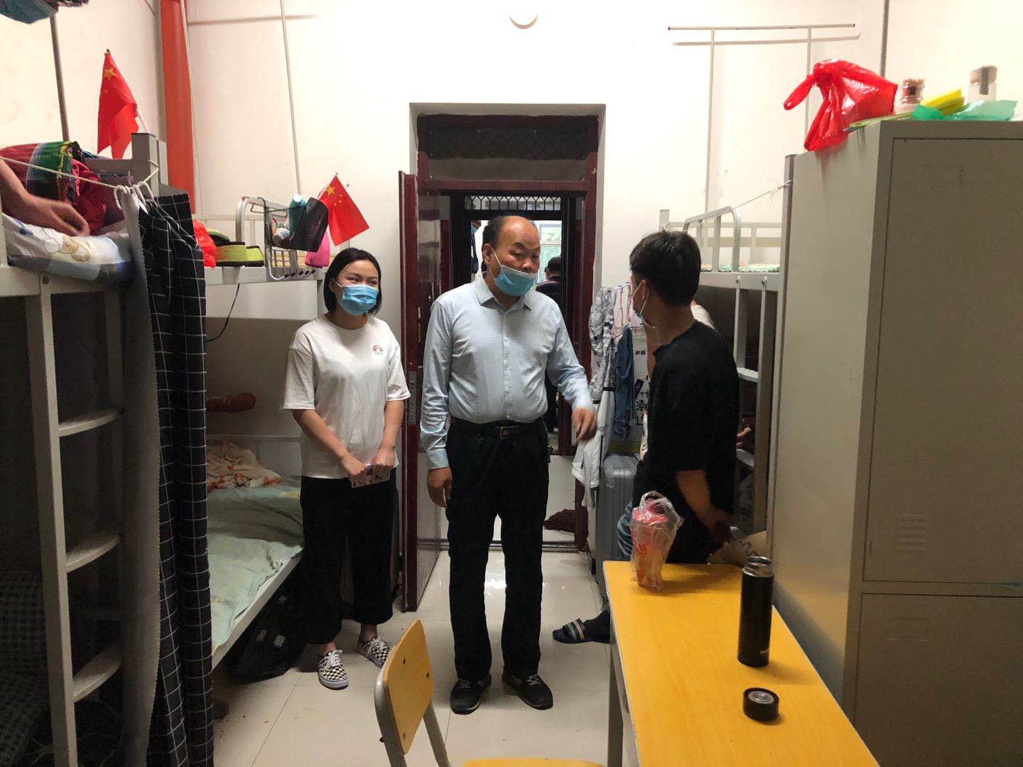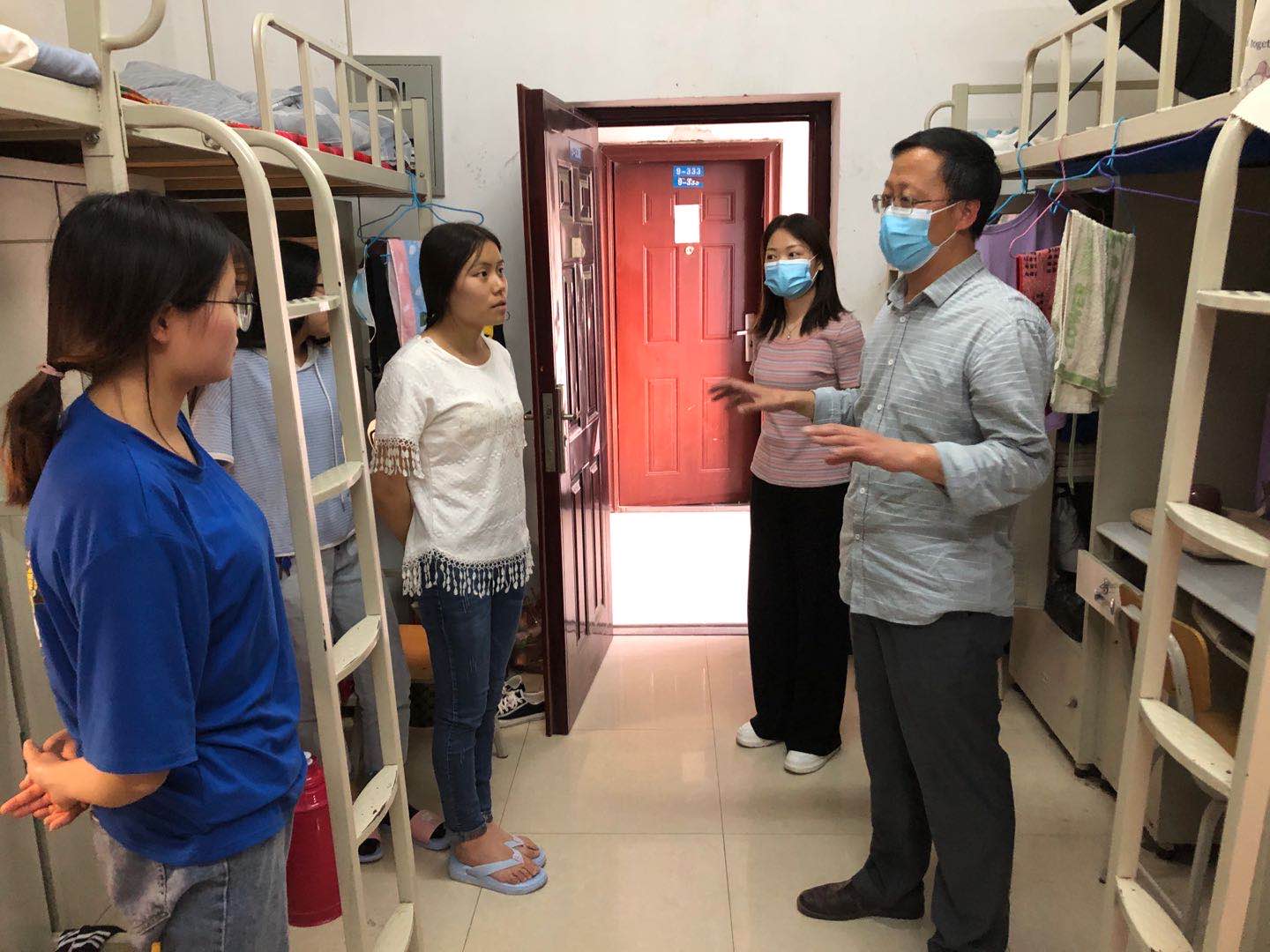 5月17日晚,澳门十大信誉好的网站党总支书记卢百龙、院长郭楚伟、副院长李有成、副书记黄翠萍、学生科科长陈旭铖、办公室主任李新萍前往学生宿舍楼看望返校学生并检查宿舍防疫工作。