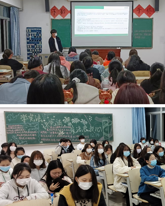 各班长通过播放相关视频与图文结合的方式让同学们对我国的宪法有了为深刻的了解,懂得了要主动地学习宪法,自觉捍卫宪法,弘扬宪法精神。各班分别从什么是宪法,宪法的作用,宪法是如何规范国家权力等方面进行了讲解,深入浅出,层层递进,使学生深入了解宪法对于普通公民的生活的意义、积极维护宪法权威等方面的知识。