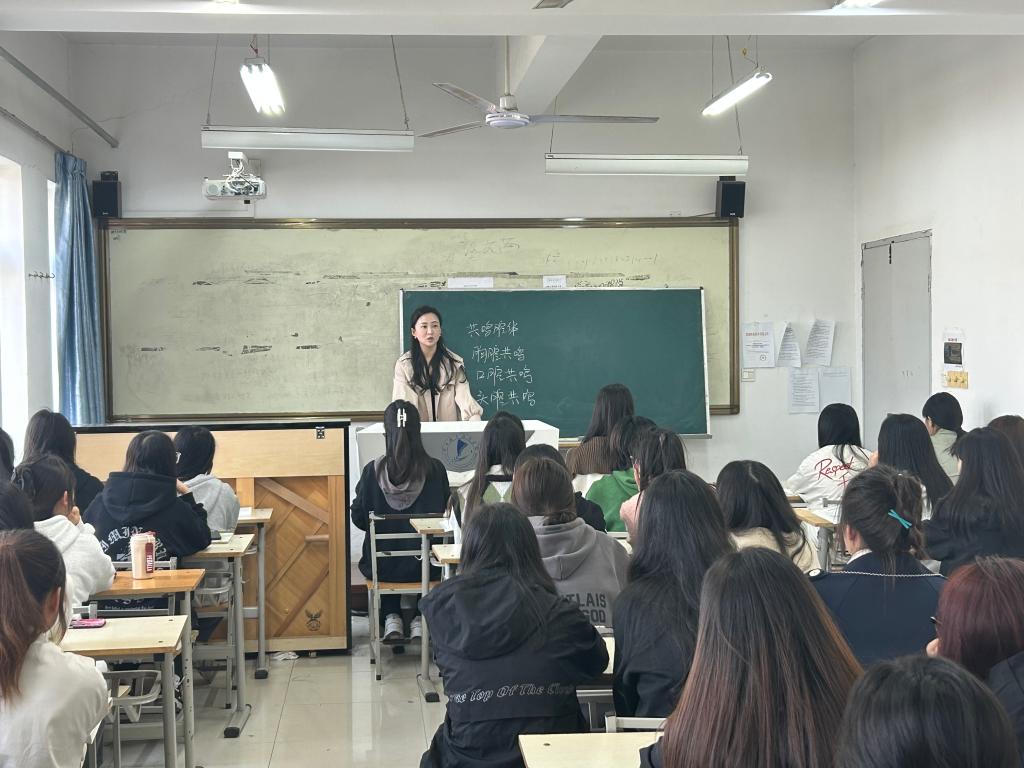 此次示范课的授课教师为新入职的张圃丽老师,她选取“歌唱中的三大共鸣腔体及歌曲‘送别’”作为教学观摩内容。活动中,授课教师讲解细致生动,教学设计层层递进,紧紧吸引着每位学生,引导学生逐渐掌握决定发声的“三腔共鸣”相关知识。同时,授课教师通过有趣的互动环节和发声示范激发了学生们对音乐的热爱之情。