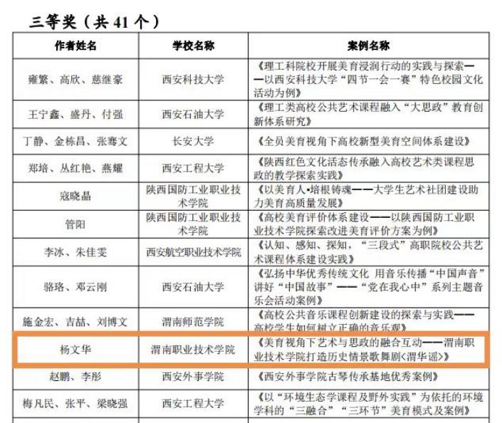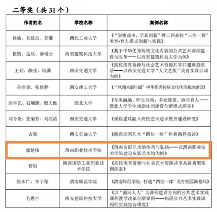 12月7日,陕西省教育厅办公室印发《关于公布全省第七届大学生艺术展演活动评选结果的通知》,在高校美育改革创新优秀案例评选中,十大信誉官网美育中心主任郭楚伟撰写的《渭南皮影艺术的传承与弘扬——以澳门十大信誉好的网站建设皮影艺术馆为例》获二等奖,美育中心副主任杨文华撰写的《美育视角下艺术与思政的融合互动——澳门十大信誉好的网站打造历史情景歌舞剧<渭华谣>》获三等奖。
