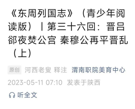 传统文化读本《东周列国志》(青少年阅读版)文字和有声版在美育中心公众号刊发。