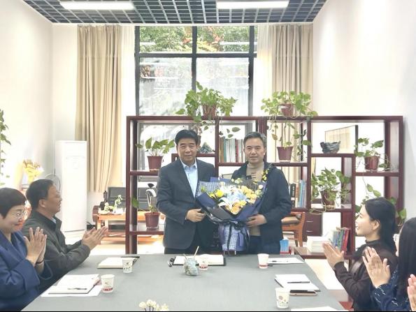 首先,王录军代表学院向罗小平授花表示祝贺,他指出,荣获兰亭奖彰显了罗小平同志在书法创作领域的卓著成绩与荣誉,不仅是对个人艺术才华与辛勤付出的高度认可,也是学院在书法教育和美育工作领域取得的重要成果,为学院增添了一份无上的荣耀。他鼓励罗小平以此为新的起点,继续发扬精益求精、勇攀高峰的精神,在书法艺术上再创佳绩,在学院专业建设中发挥更大的引领作用,带动更多的师生共同进步,为学院艺术教育事业作出新的更大贡献。