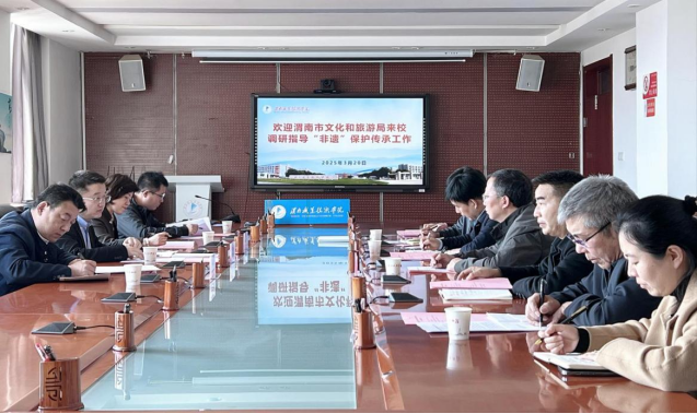 3月20日下午,渭南市文化和旅游局副局长刘泉、非遗科科长马淑宁一行四人来十大信誉官网调研非物质文化遗产保护传承工作。校党委副书记王录军,教务处、科研处、澳门十大信誉好的网站、美育中心负责人及十大信誉官网客座教授、渭南市皮影协会主席李天社参会。会议由教务处处长魏恒主持。