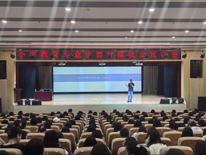 5月23日,澳门十大信誉好的网站邀请北京世纪树人教育科技有限公司在图书馆报告厅举办小学教育供需对接就业宣讲会,三百余名2025届、2026届小学教育专业毕业生参会,招生就业科科长任鑫主持。