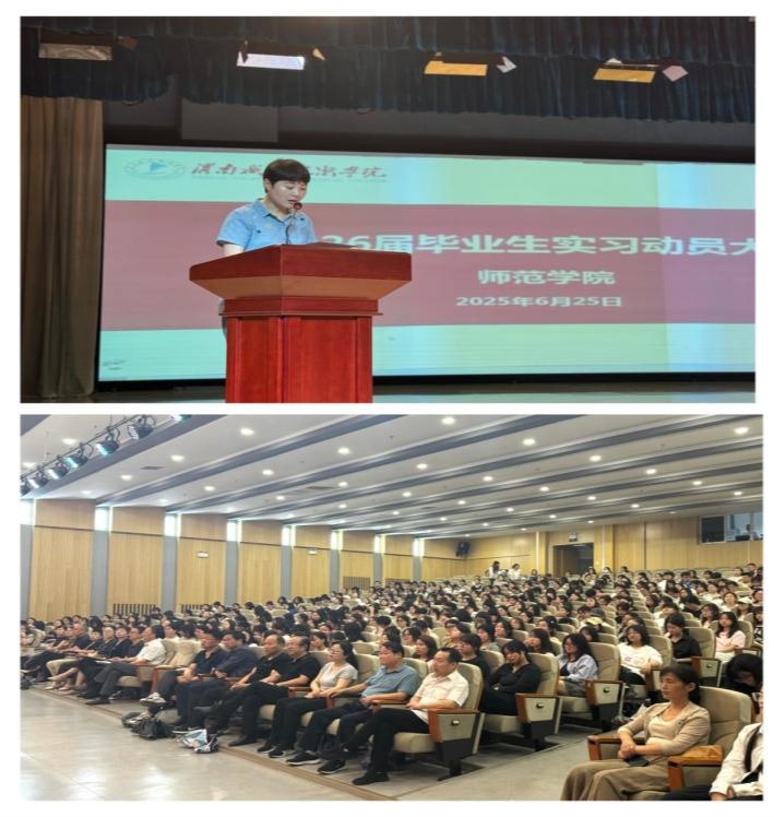 6月25日上午,澳门十大信誉好的网站在图书馆报告厅召开了2026届毕业生实习动员大会。党总支书记杨瑞侠,院长郭楚伟,党总支副书记黄翠萍,副院长于晶汝、李永明,团总支书记左馨,实习指导教师代表及1000余名2026届毕业生参会。大会由黄翠萍主持。