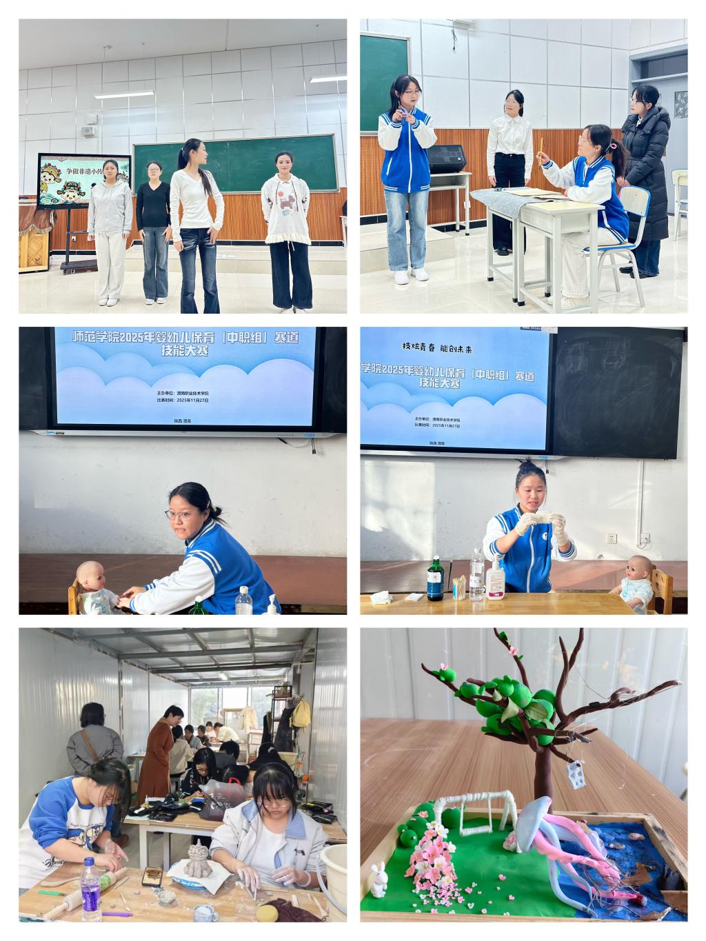 本次大赛对接世界职业院校技能大赛标准,设立了教育与体育、婴幼儿保育(中职组)、艺术设计三大赛道。教育与体育赛道比赛中,参赛选手基本功扎实,语言感染力强,用精彩的说课、扎实的技能展现出积极向上的青春风采;婴幼儿保育(中职组)赛道比赛中,选手们沉着应对,娴熟完成抚触、急救等操作,尽显爱心与专业;艺术设计赛道比赛则用指尖艺术演绎教育智慧,选手们将平凡的彩泥化作灵动的艺术,创作出一幅幅主题鲜明、造型巧妙的作品,赢得了在场师生的阵阵掌声。
